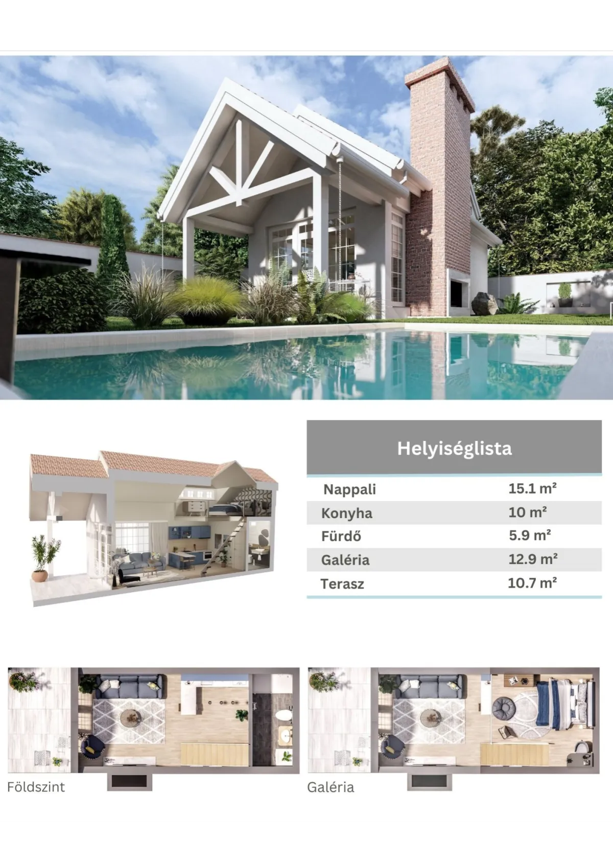 Ideális 2-4 fő számáraBruttó 50 m2 + 13 m2 galériaNettó 56 m2Ajánlott telekterület: minimum 300 m2Kész állapotban: 12.756.870 Ft-tól