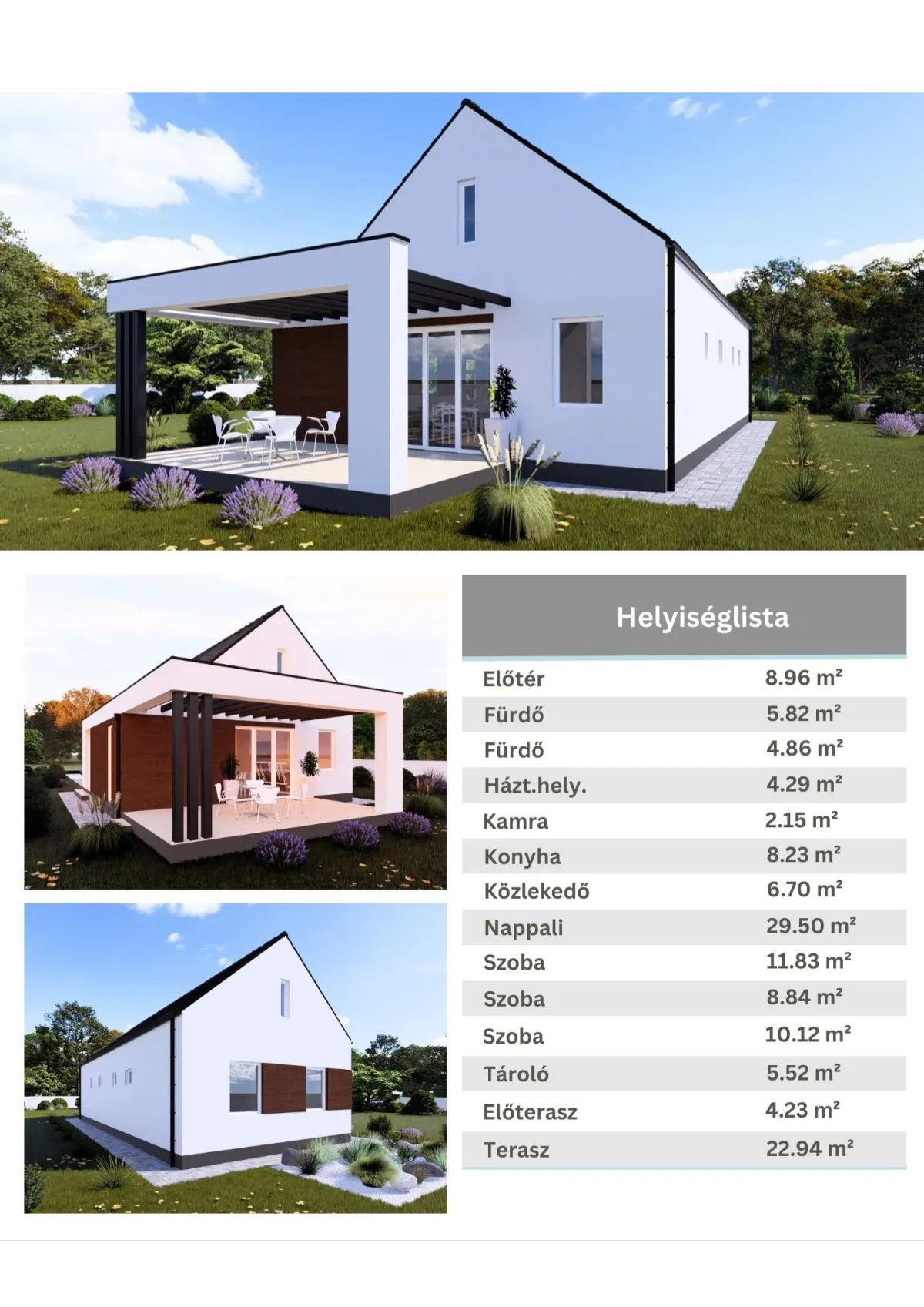 Ideális 2-5 fő számáraBruttó 128 m2Nettó 107 m2Ajánlott telekterület: minimum 500 m2Kész állapotban: 24.766.720 Ft Ft-tól