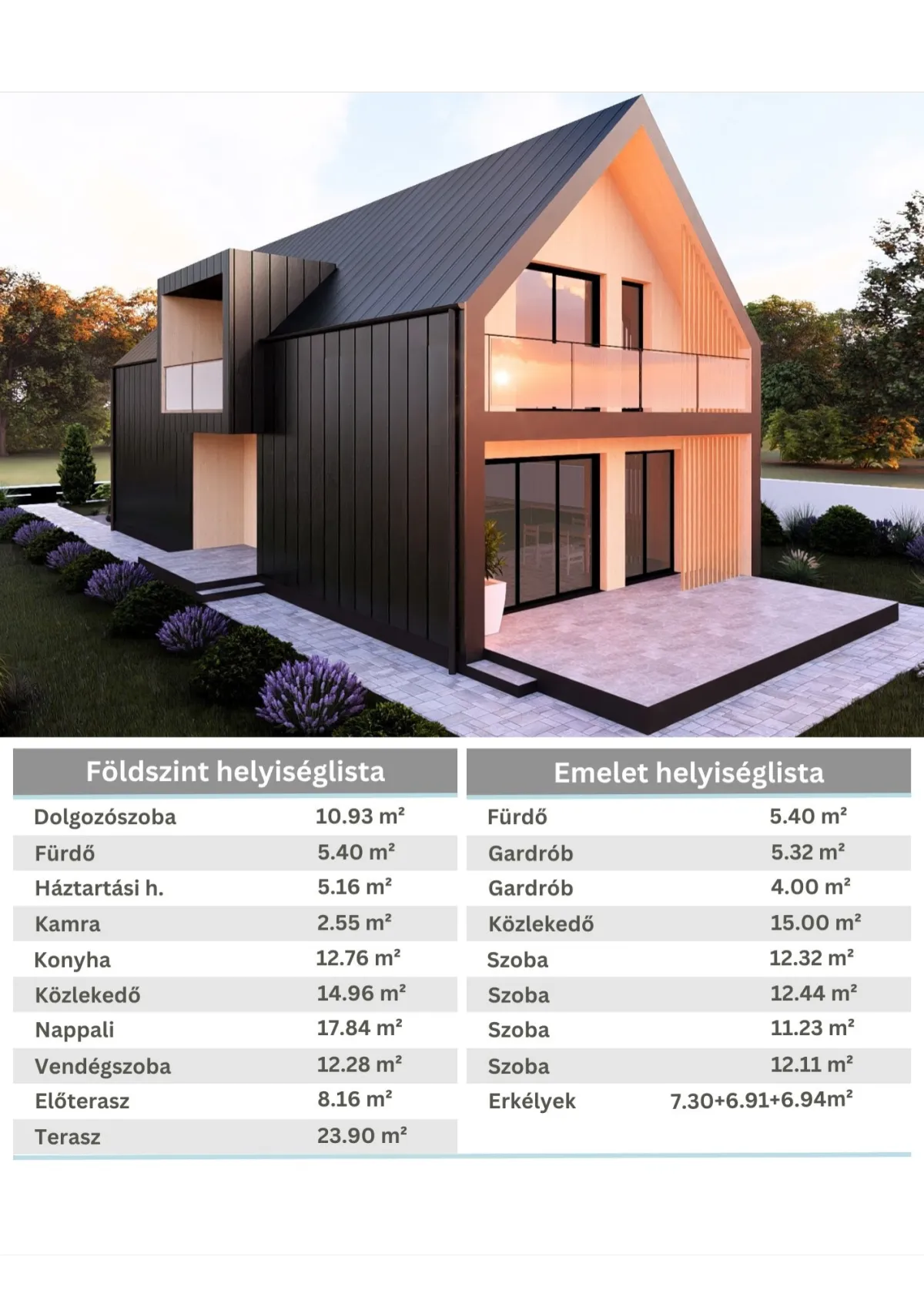 Ideális 2-6 fő számáraBruttó 118 m2Nettó 82 + 78 m2Ajánlott telekterület: minimum 500 m2Kész állapotban: 43.380.458 Ft-tól