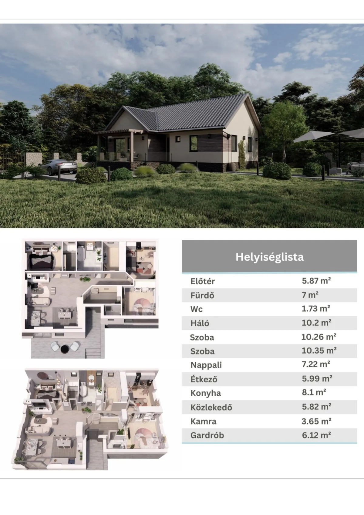 Ideális 2-6 fő számára (1-2 generáció)Bruttó 115 m2 + teraszNettó 94 m2Ajánlott telekterület: minimum 500 m2Kész állapotban: 22.251.350 Ft-tól