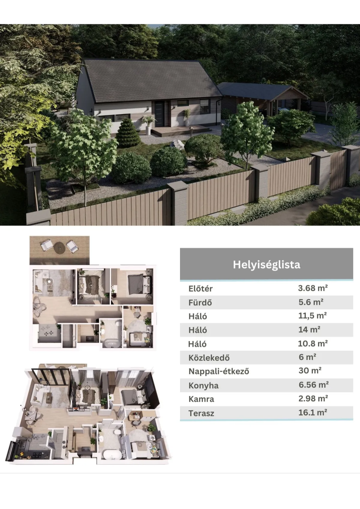 Ideális 4-6 fő számáraBruttó 101 m2Nettó 88 m2Ajánlott telekterület: minimum 800 m2Kész állapotban: 19.542.490 Ft-tól