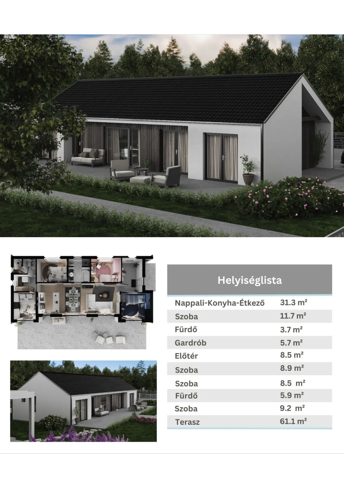 Ideális 3-5 fő számáraBruttó 111 m2Nettó 107 m2Ajánlott telekterület: minimum 500 m2Kész állapotban: 21.477.390 Ft-tól